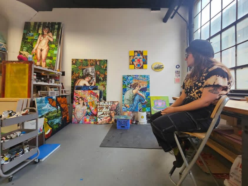 I’ve started with this piece of my friend and studiomate, J Nelson – one day, J was driving us to drop off one of my pieces that, of course, is too large to fit in my tiny car and i asked them if they would be open to me painting them. I told them my idea and in the 40 minute car ride they gave me enough details and examples of their individual queerness and relationship with being nonbinary that i felt i had more than enough to work with.
