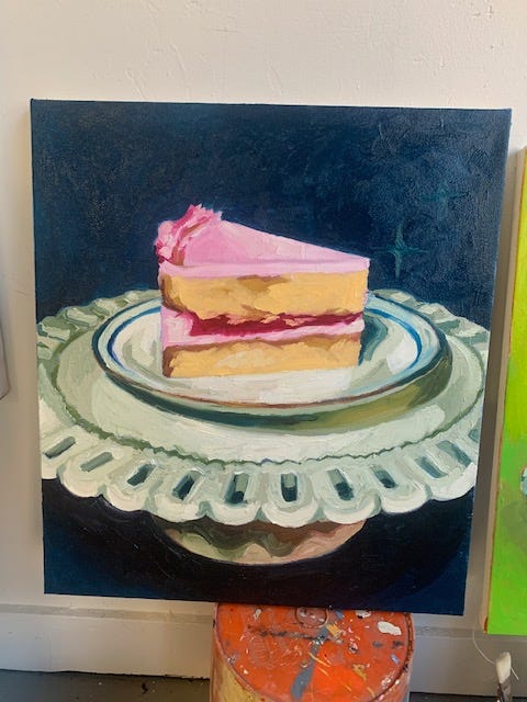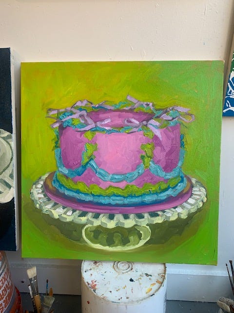 One of the shows is all portraits/figures but everyone has a pretty funky and colorful style, which i am honored to be part of. The other show also has a very fun theme, and i am equally as honored to be a part of, the theme being sweet tooth! A few months ago i started working on this little painting of a cake based on one of Venla’s cakes - which are as delicious as they are beautiful. Never do i post a piece of art on instagram and think it will lead to someone asking me to make art for an upcoming show, but that is what happened in this case! Painting the figure will always be my favorite, but it has been nice to switch it up and do some things that are out of my comfort zone, like the cakes and the landscape commission i have been working on for a little now.